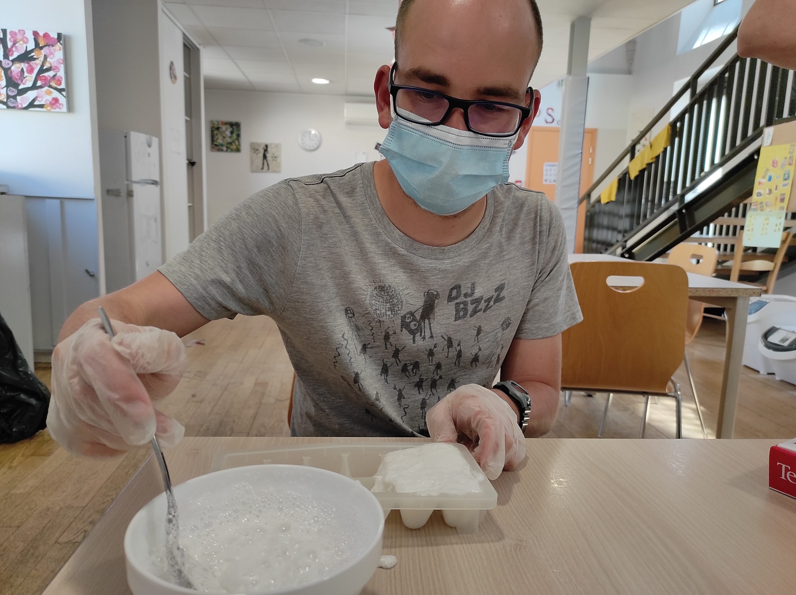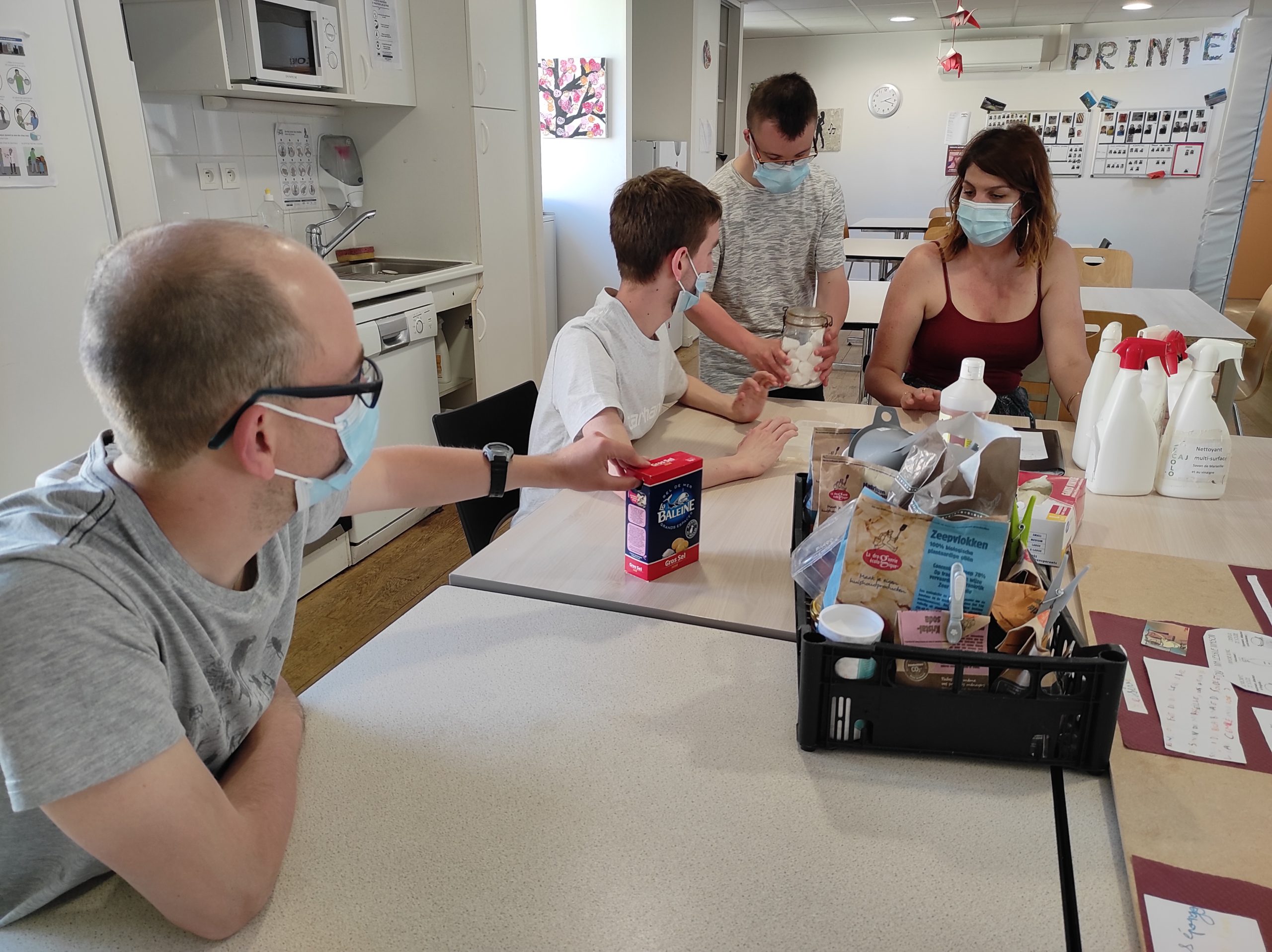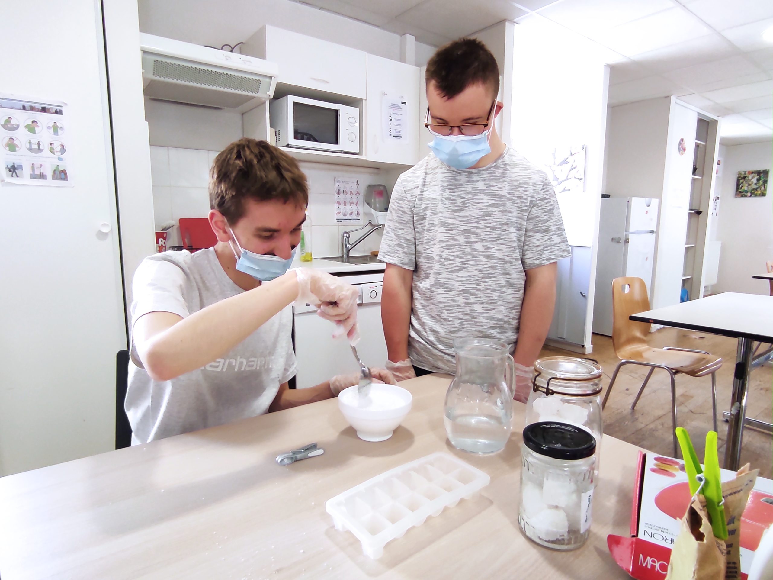50g de bicarbonate de soude, 2 cuillères à soupe d’eau… certains commencent à connaitre la recette par cœur. Ce jeu de chimiste est le préféré de la petite équipe et tous semblent prendre plaisir à peser, transférer, mesurer. Les textures se transforment et le résultat est là. A peine terminés, les jeunes peuvent utiliser avec fierté les produits réalisés pour les missions de la semaine dont ils ont la charge.