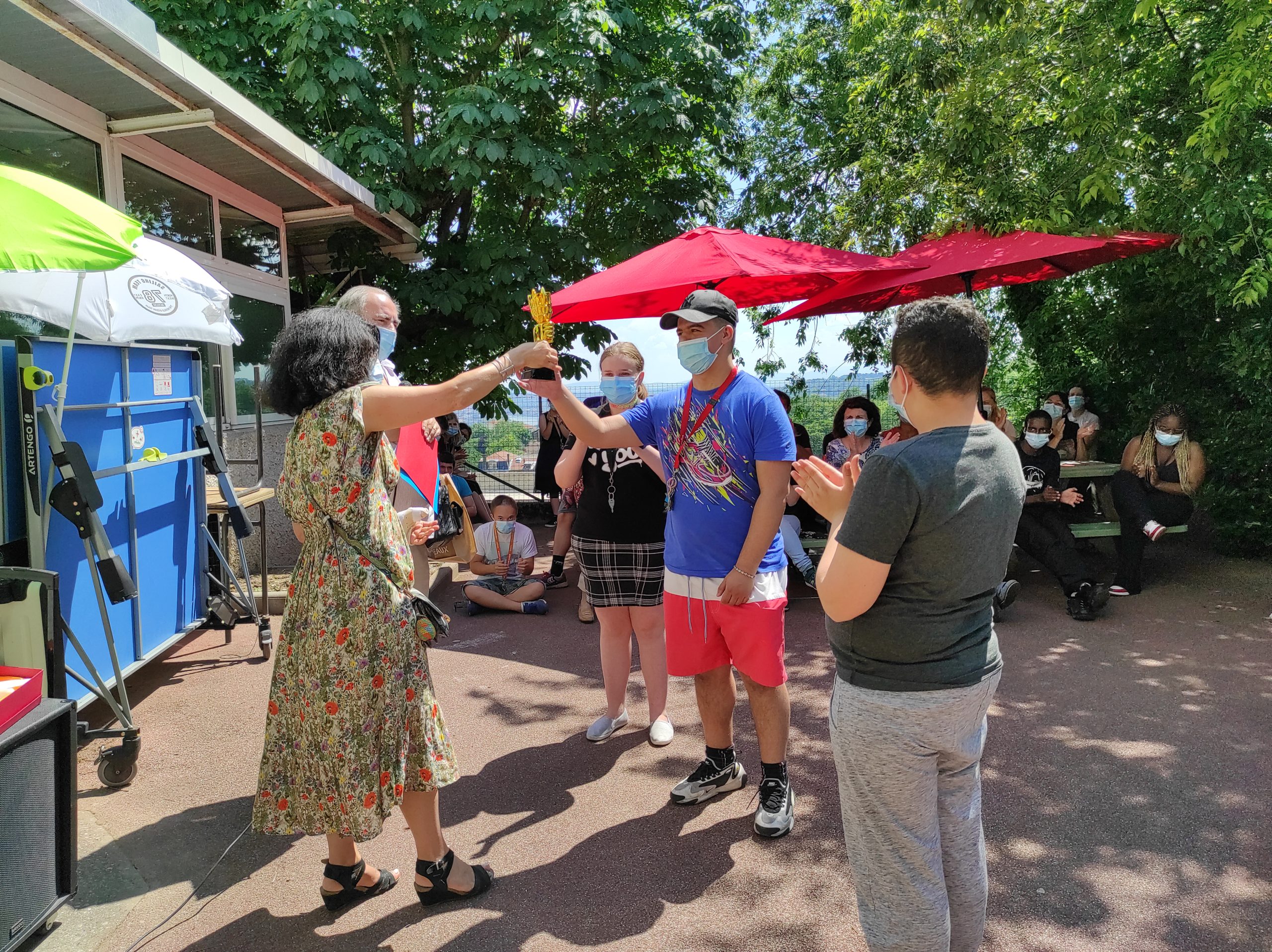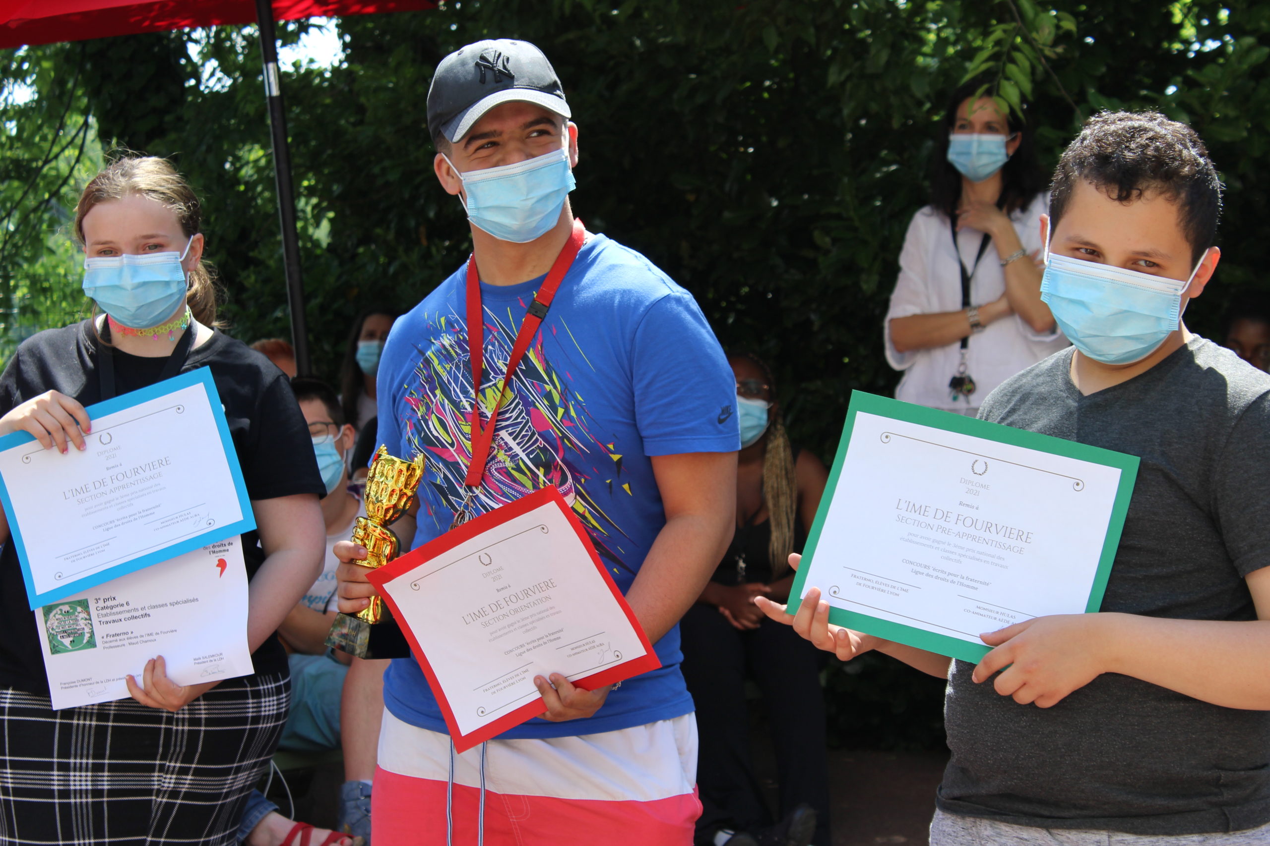 Jeudi 10 juin, par un beau soleil d’été, l’ensemble des jeunes et des équipes encadrantes se sont retrouvés avec émotion dans la cour ombragée de l’IME. Les mots de l’équipe de direction (Mme Chamoux, directrice du site de Fourvière et Cécile Deschère, cheffe de service de l’IME) et des représentants de la Ligue des Droits de l’Homme présents ont été écoutés avec émotion. Puis pour féliciter et remercier de ce beau travail réalisé, le trophée a été remis collectivement. Les jeunes se sont dit fiers de l’obtention de ce prix et ont déjà de beaux projets en tête pour poursuivre l’aventure et aller toujours plus loin dans leur réflexion et sensibilisation à la citoyenneté.